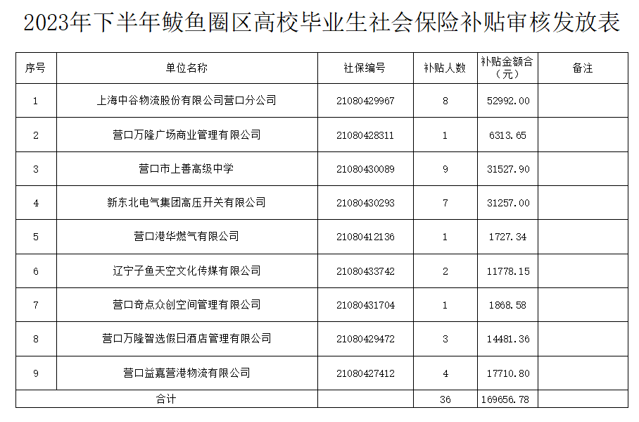 附表:12023下半年鲅鱼圈区高校毕业生社会保险补贴审核发放表