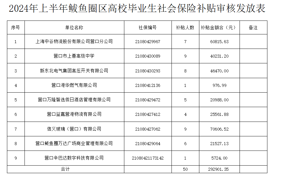 根据《营口市进一步促进高校毕业生等青年群体就业创业若干政策措施》(营就办发20224号)及《营口市进一步促进高校毕业生等青年群体就业创业若干政策措施的补充通知》营就办发20244号)文件精神,为落实好高校毕业生社会保险补贴政策,鼓励、支持企业引进人才,促进我区高校毕业生稳定就业。现将营口市鲅鱼圈区人力资源和社会保障事务中心审核拟发放2023下半年、2024年上半年企业吸纳高校毕业生社会保险补贴名单予以公示。